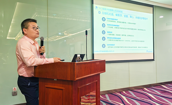 克萊門特市場部經理楊前紅先生對克萊門特磁懸浮冷水機組進行了詳細介紹。克萊門特磁懸浮系列冷水機組具有極高部分負荷能效,非常適用于對能效有較高要求的用戶,同時無油系統可以有效節省用戶使用維護成本。