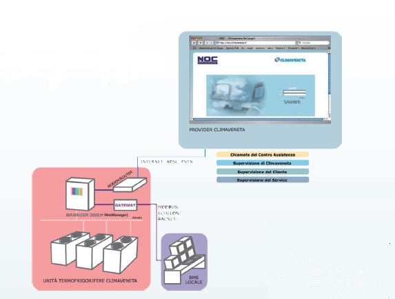 空調系統群控系統MANAGER 3000通過中央空調機組和外圍設備的自動化控制達到節能,精確控制和操作維護的方便。 可控制8臺Climaveneta空調機組 適用于: 水/風冷冷水機組,水/風冷熱泵,帶部分/全熱回收功能機組,能量提升機組等四管制系統
