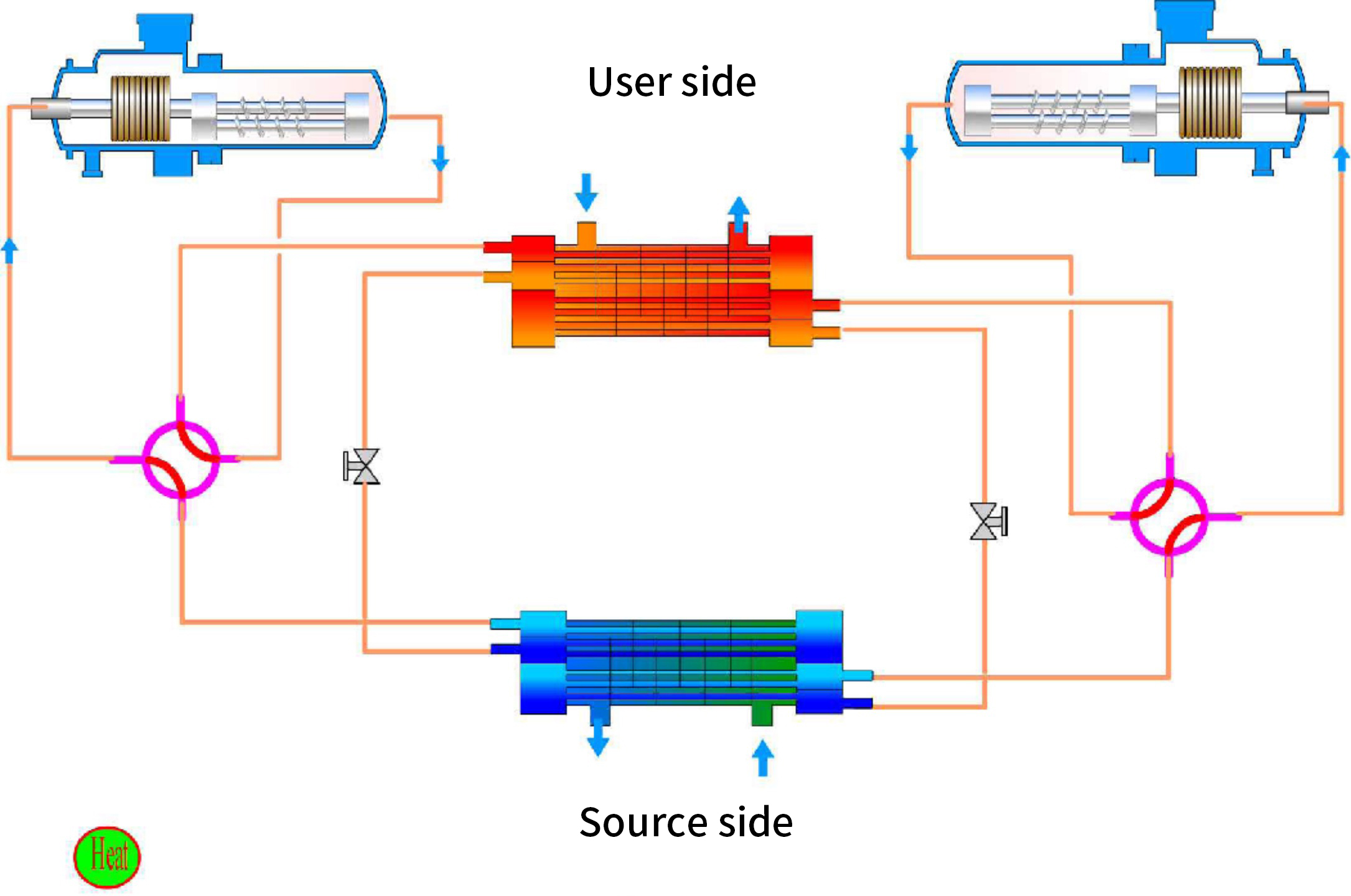 1.RECS-W series screw-type water ground source heat pump is suitable for two-pipe unit, which can meet the cooling or heating needs. The switching of cooling and heating modes is realized by automatic control of the reversing valve inside the unit, and the operation is simple and convenient.